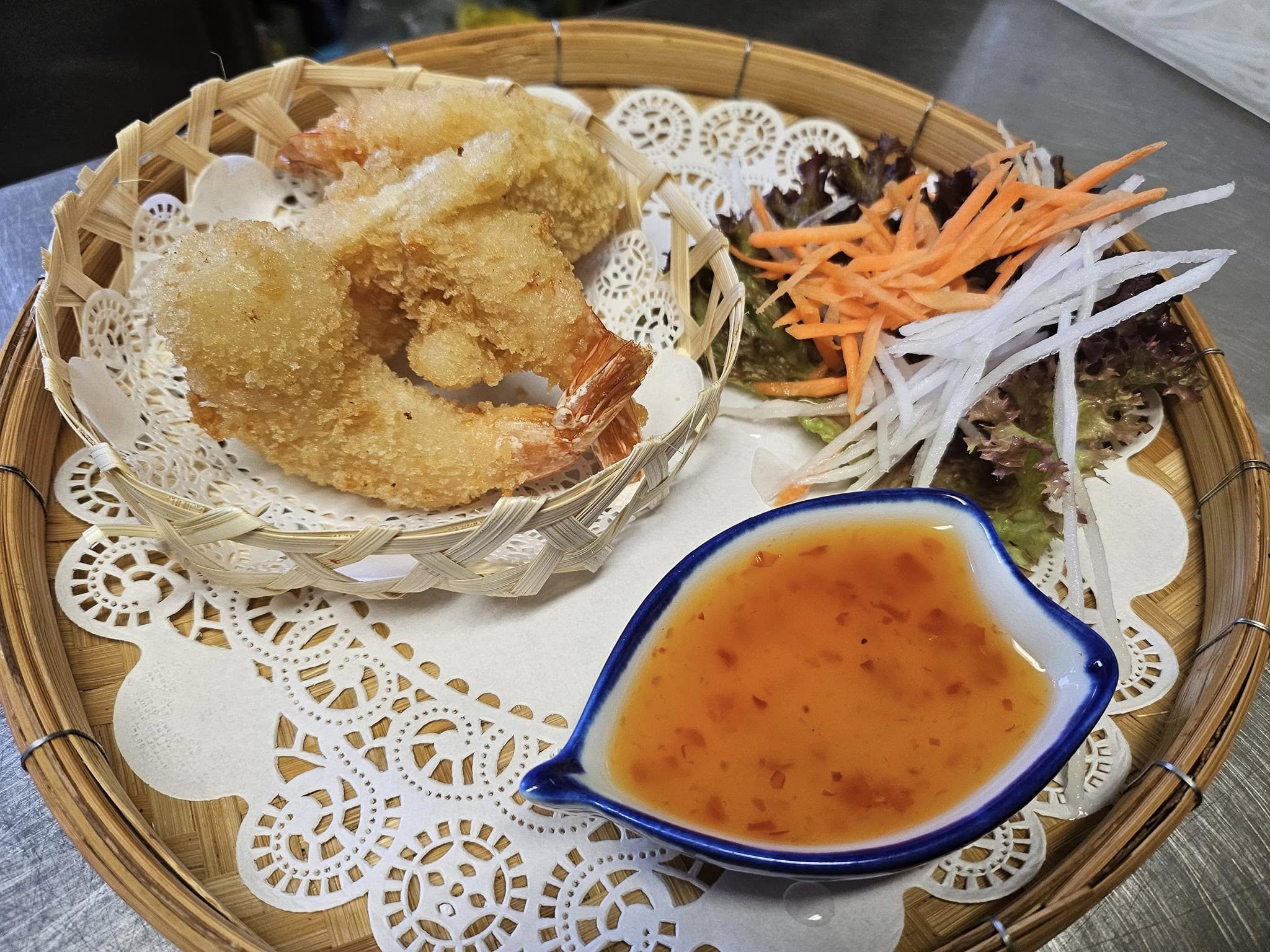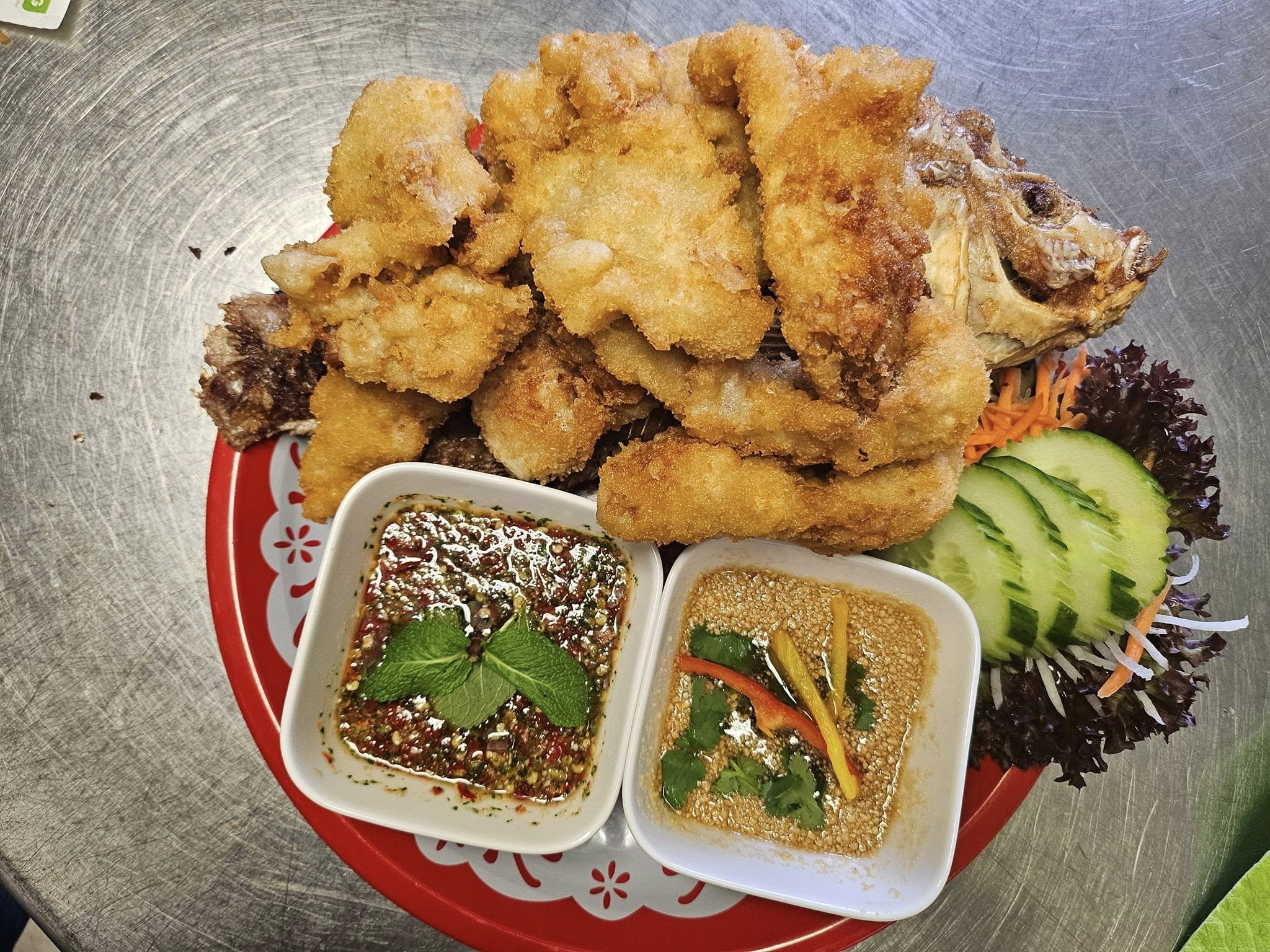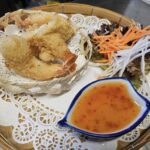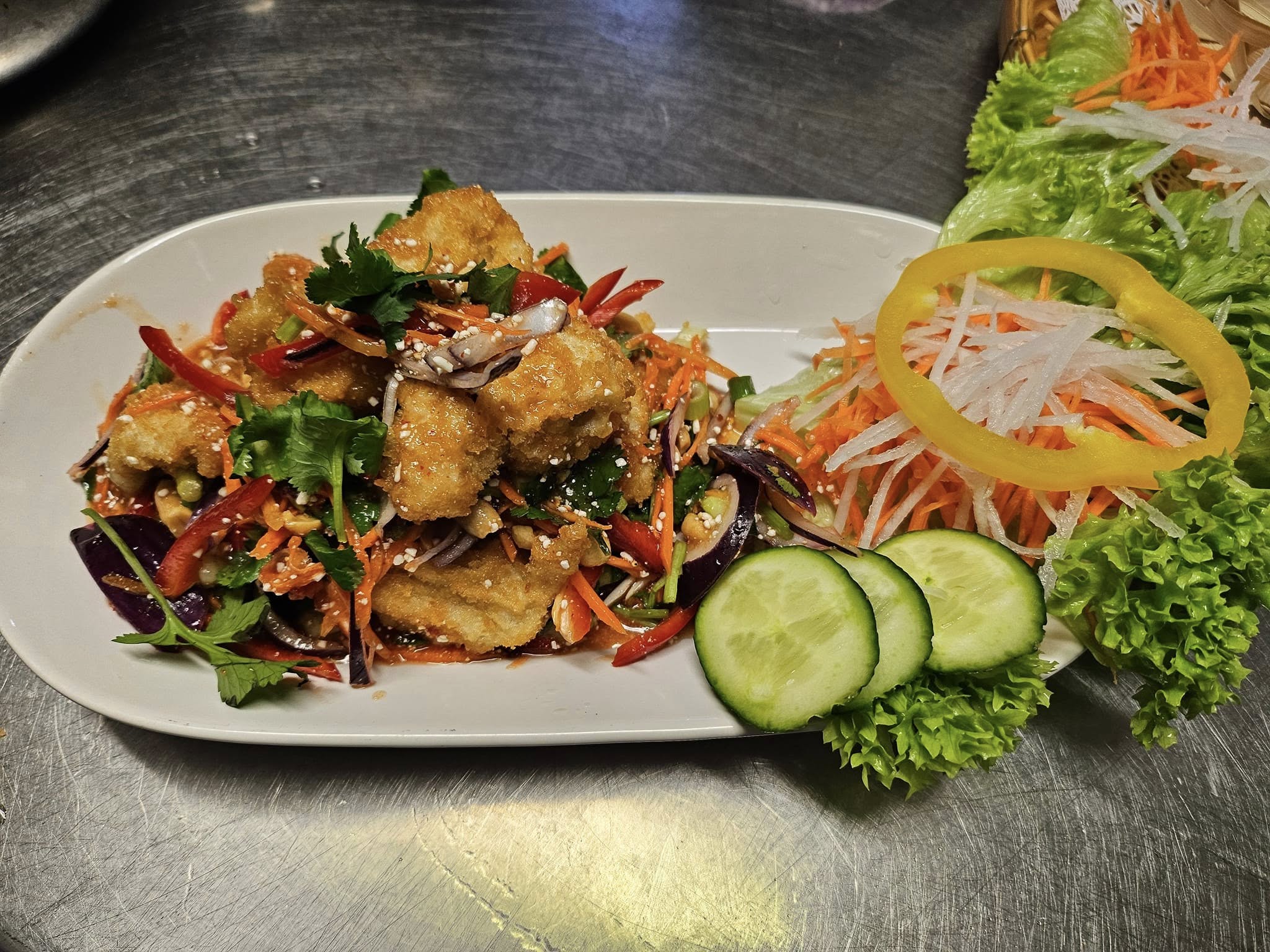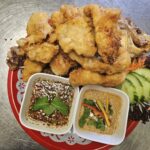 Giew Thod, Por Pia Thod, Mük Thod (frittierter Tintenfisch), Thod Man Gai, Gung Thod, Ste Gai mit 2 Soßen für 2 Personen