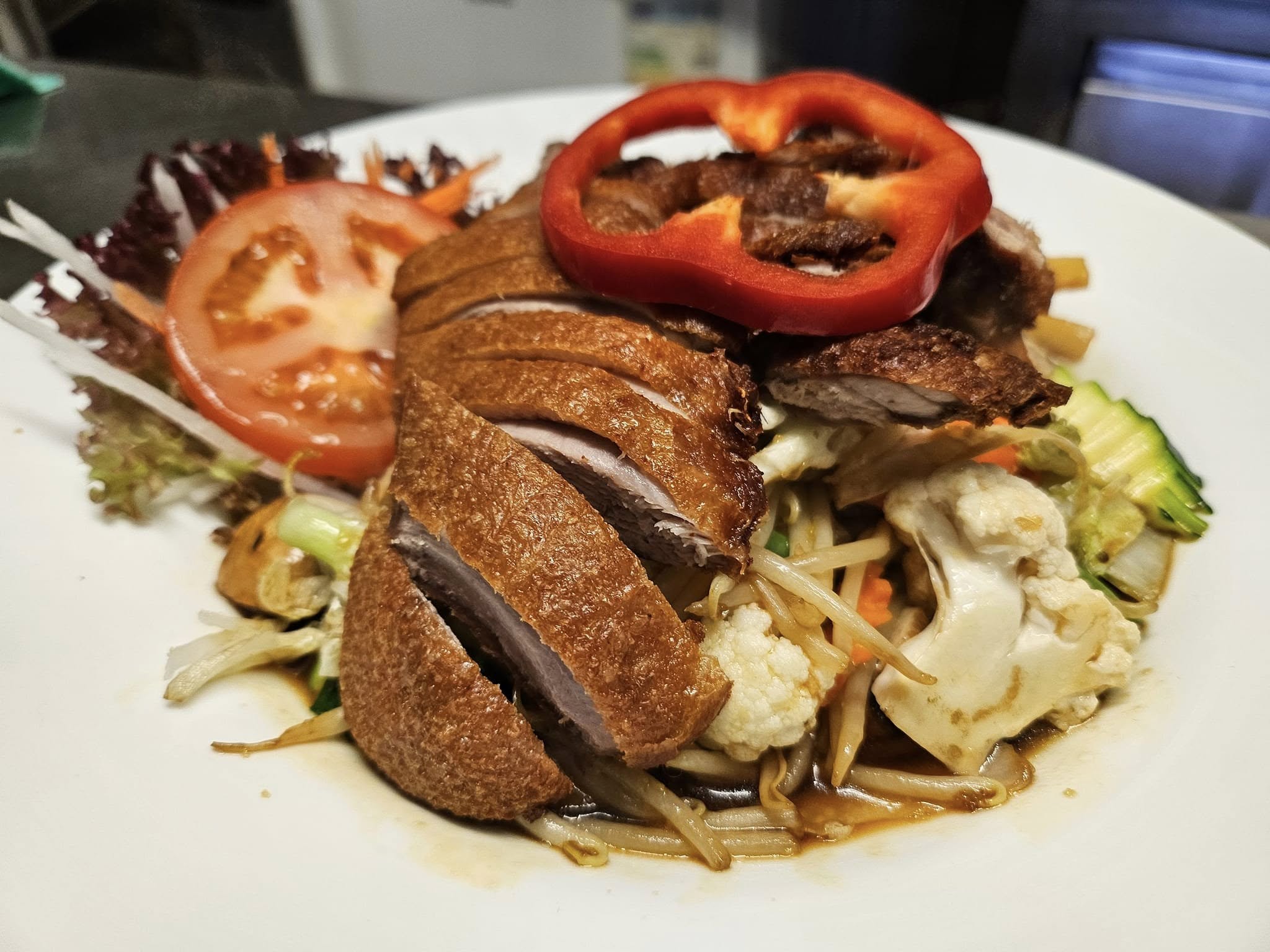 Knusprig gebratene Ente mit Brokkoli, Karotten, Zucchini, spitzkohl, grünen Bohnen, Blumenkohl und Shiitake Pilzen