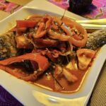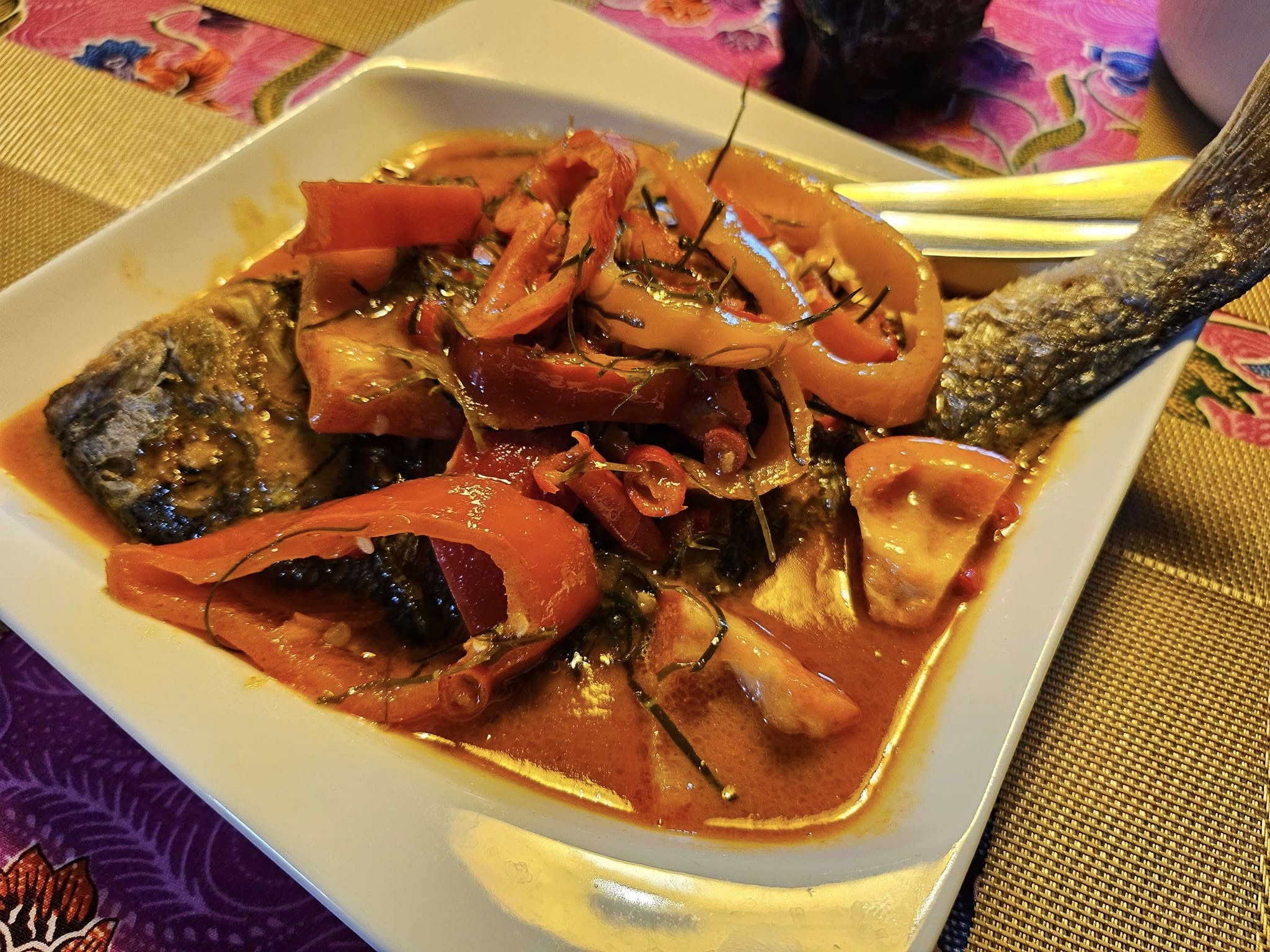 Lachs in Kokosnuss Panäng Curry mit Paprika, gemahlene Erdnüsse (18) und gehackte Zitronenblätter